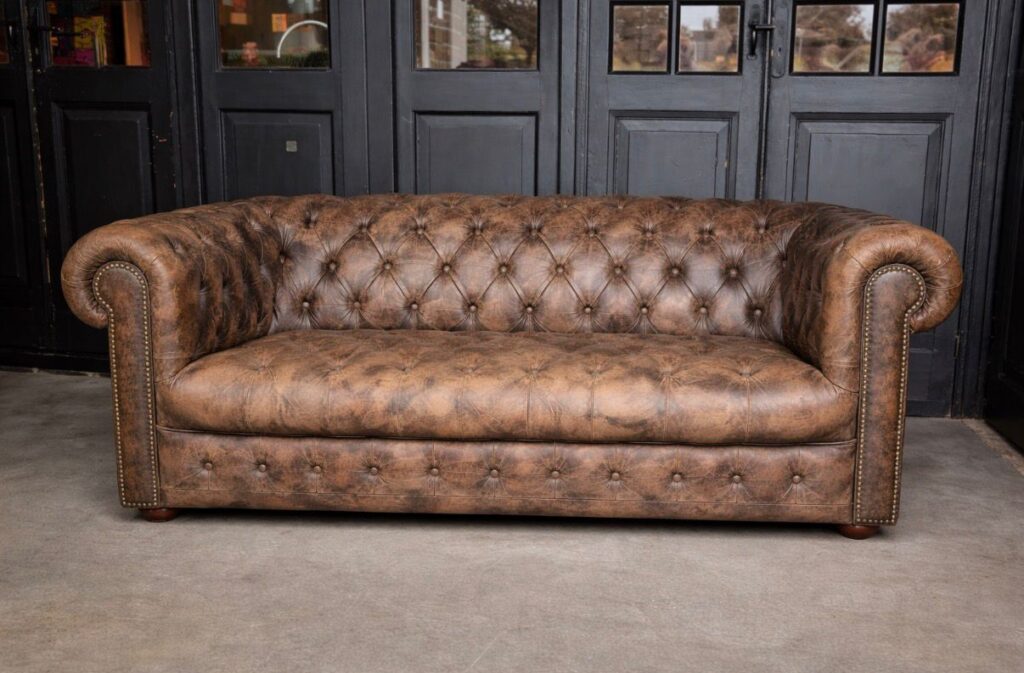 De bank verkeerde in een sterk verouderde staat en vertoonde duidelijke sporen van intensief gebruik. Het leer was zichtbaar versleten, met scheuren, verkleuringen en diep ingetrokken vlekken. De zitkussens hadden hun veerkracht verloren, waardoor het zitcomfort aanzienlijk was afgenomen. Ook de houten poten vertoonden krassen en slijtage. Door deze gebreken was een volledige restauratie noodzakelijk om de bank weer in optimale staat te brengen.