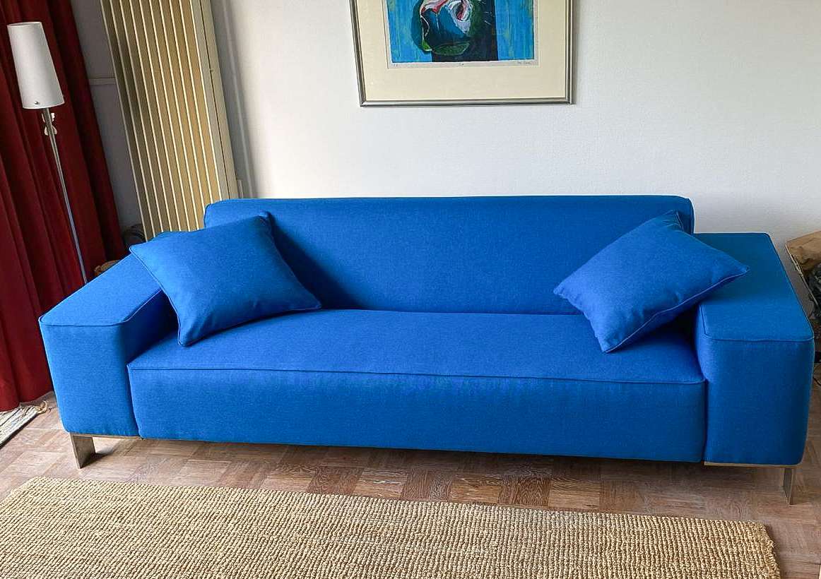We hebben de bekleding vervangen door nieuwe stof van hoge kwaliteit. De kussens zijn opnieuw gevuld voor beter comfort. De houten poten zijn geschuurd, gelakt en hersteld. Na reiniging en bescherming heeft de bank zijn uitstraling en comfort terug.