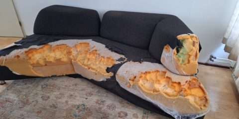 De bank had ernstige schade opgelopen door een hond die grote stukken bekleding en schuim had uitgebeten. Op meerdere plekken ontbrak de stof volledig, waardoor de vulling zichtbaar en beschadigd was. Door deze schade had de bank niet alleen zijn uitstraling verloren, maar bood hij ook geen zitcomfort meer.